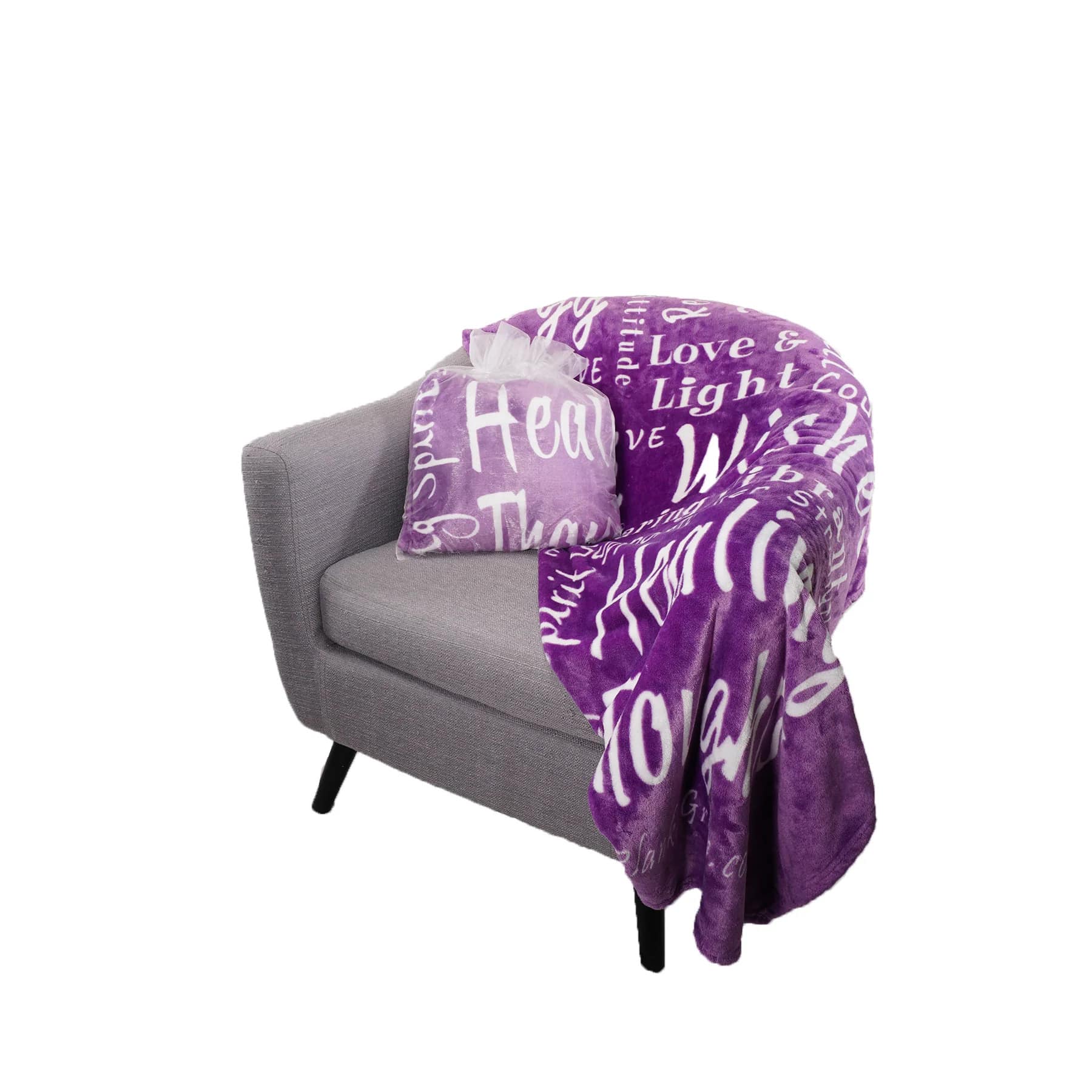 The Healing Wishes blankie features phrases like healing energy, positive attitude, and warm hugs. You can choose from purple, gray, or teal, which all have different meanings. Purple encourages sleep, soothes stress, and decreases pain sensitivity. Gray represents meditation and calm energy. Teal offers increased energy and companionship.