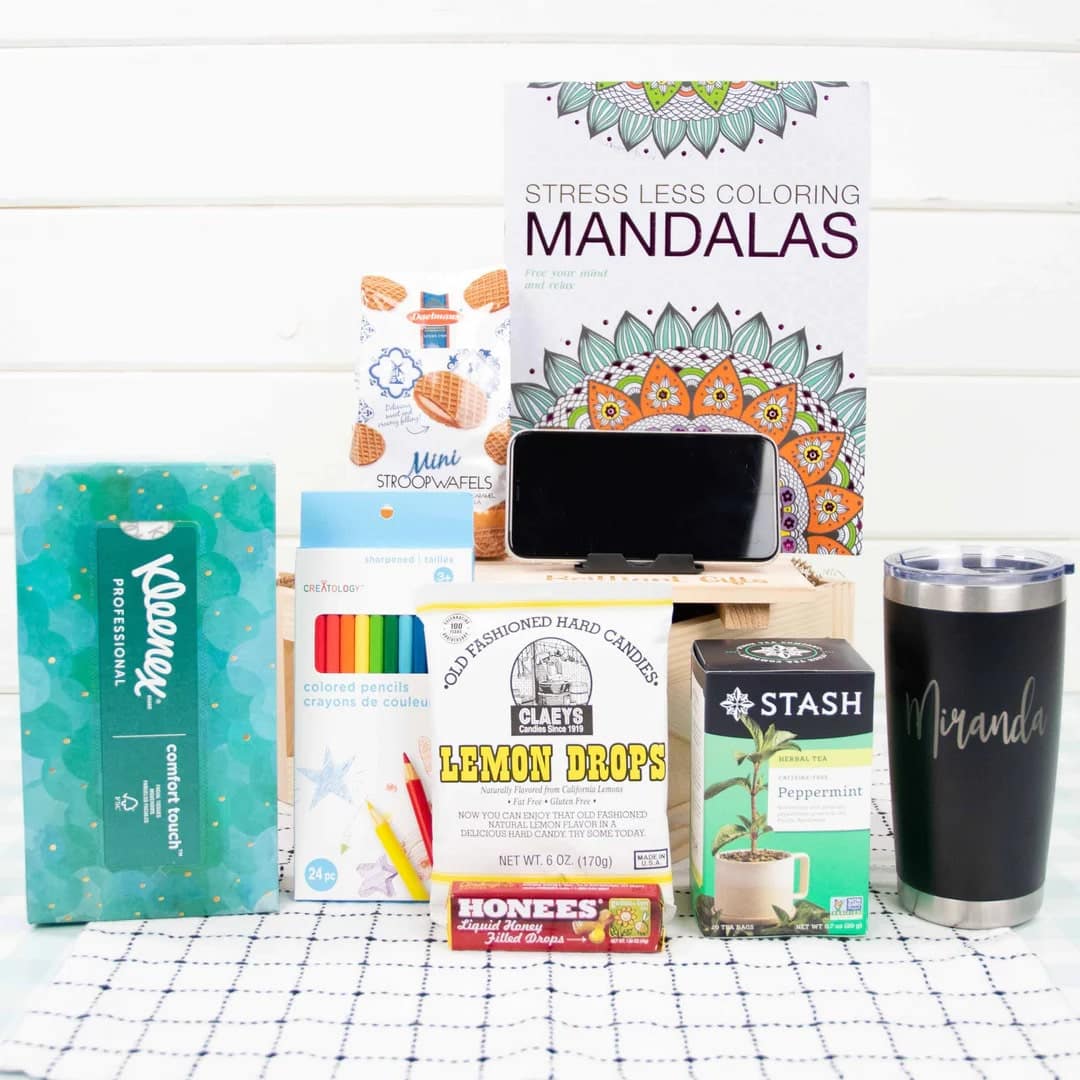The Sorry You Feel So Waffle box comes with mini stroopwafels, peppermint tea, a phone stand, an adult coloring book and colored pencils, hard candy and honey drops, tissues, and a coffee mug with free name engraving.