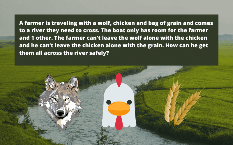 “A farmer is traveling with a wolf, chicken and bag of grain and comes to a river they need to cross. The boat only has room for the farmer and 1 other. The farmer can’t leave the wolf alone with the chicken and he can’t leave the chicken alone with the grain. How can he get them all across the river safely?”