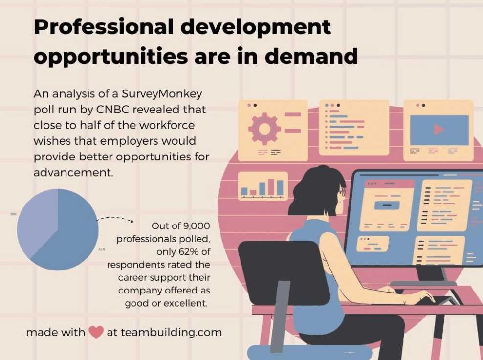 An analysis of a SurveyMonkey poll run by CNBC revealed that close to half of the workforce wishes that employers would provide better opportunities for advancement. Of 9,000 professionals polled, only 62% of respondents rated the career support their company offered as good or excellent.