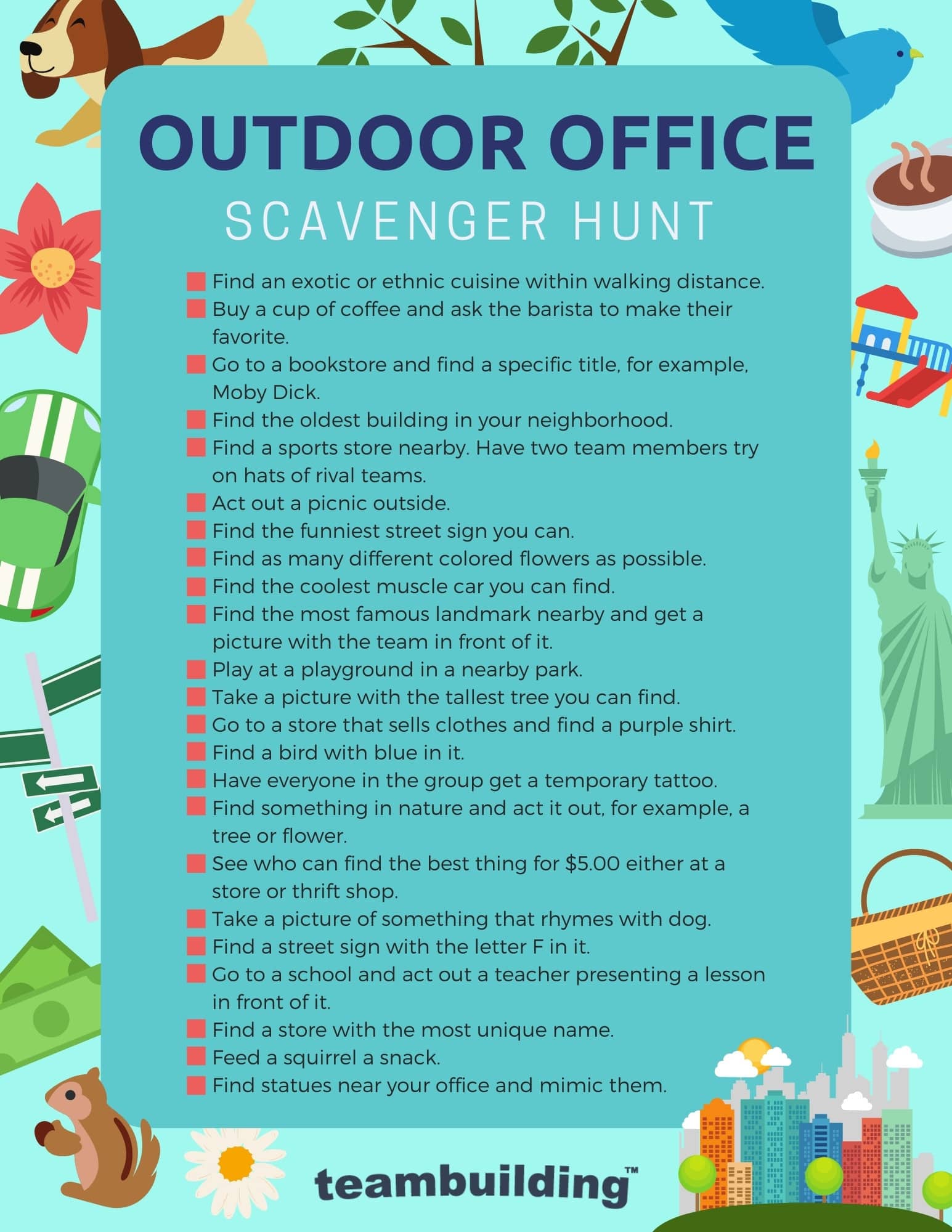 If you have a smaller office space, then consider sending team members outside with this office scavenger hunt list for adults. You can include street signs, buildings, and even wildlife in an outdoor hunt. Plus, participants get some fresh air and a change of scenery.