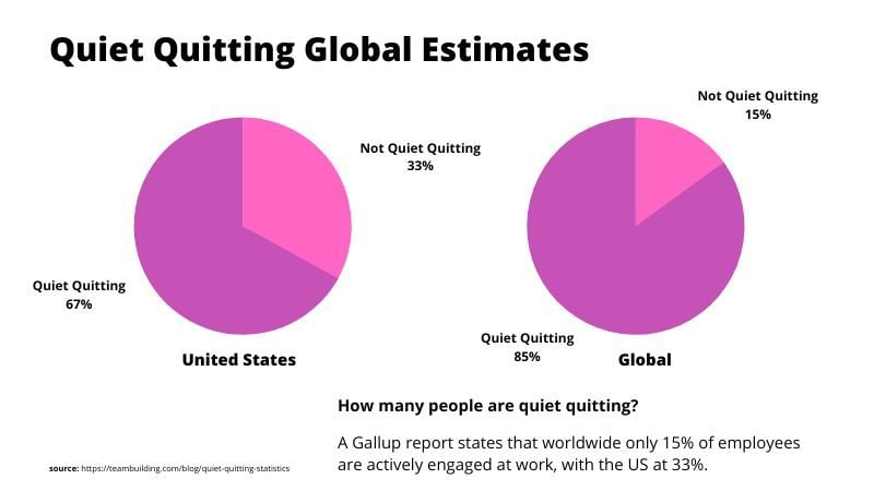 A Gallup report states that only 15 percent of employees are actively engaged at work, which means up to 85% could be quiet quitting. The numbers are a little better for the US, with 33% of employees engaged at work, approximately twice the worldwide average.