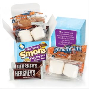 This “We Need S’more Employees Like You” treat pack is one of the most popular s’mores kits for employee appreciation. Each kit contains basic s’mores ingredients and has a message of gratitude printed on the box. If you add a tealight candle, then you are all set to host a delightful remote campfire to thank hard-working team members.