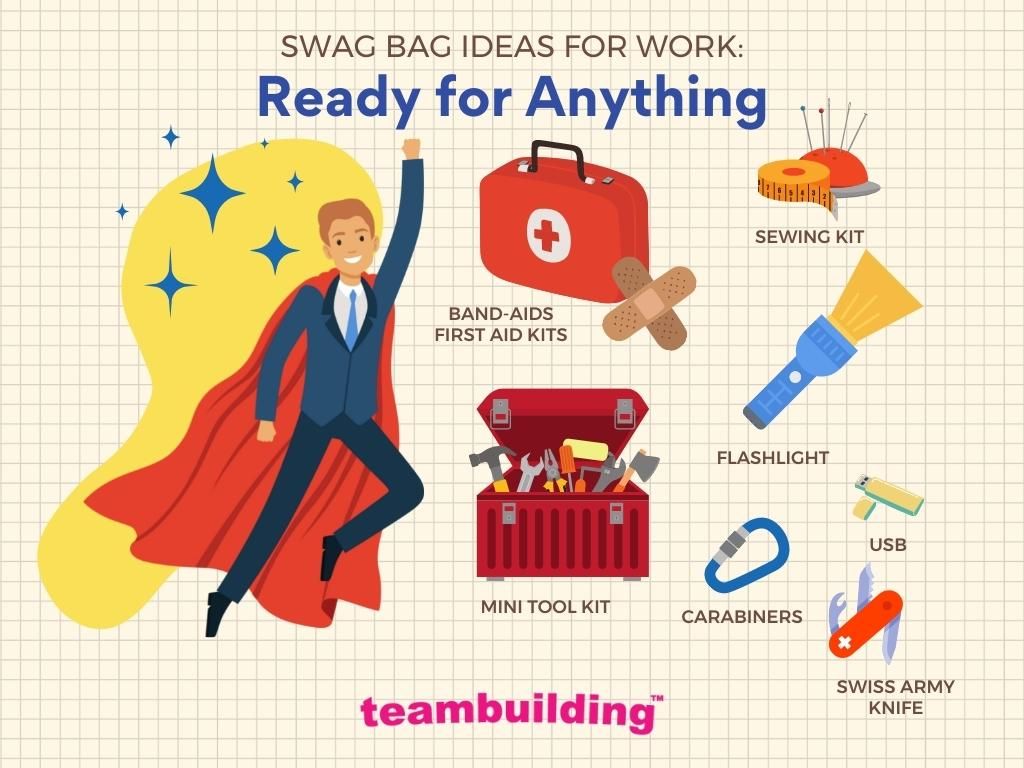 Items to include: Band-aids/first aid kits, sewing kits, mini tool kit, flashlight, Swiss army knives and multi-tools, USB, flashlights, keychains and carabiners, mini toolkit