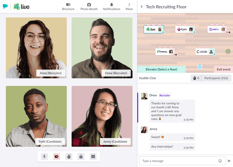 Brazen is a remote event software designed for virtual career fairs. The program facilitates online hiring events with video interviews, live streams, digital networking, and recruiting chatbots. The platform is easy to navigate for both applicants and hirers, and includes tools such as customizable booths and postings, search features, and digital queues. The program also offers tools for event promotion and candidate sourcing, as well as reporting functions that help measure event impact and follow-up features that help recruiters keep in touch with promising candidates.