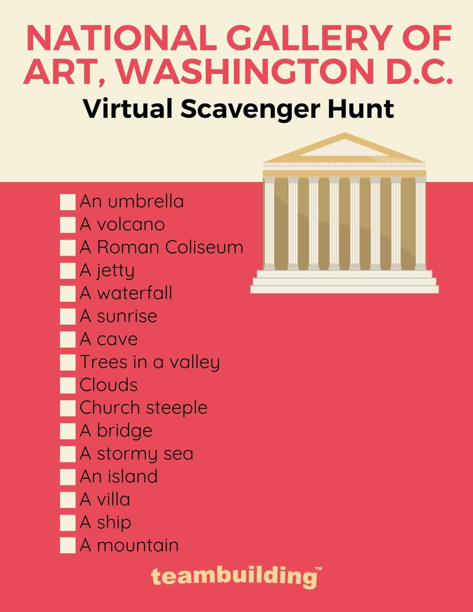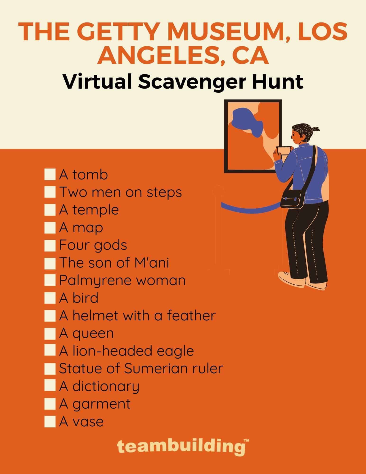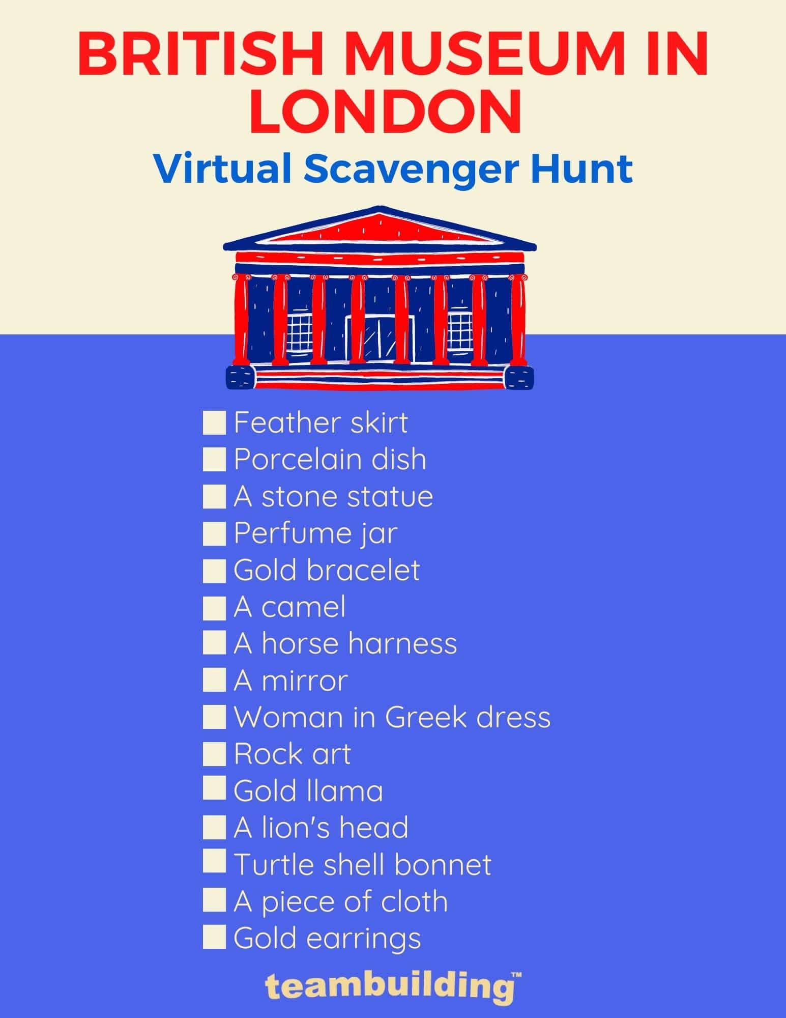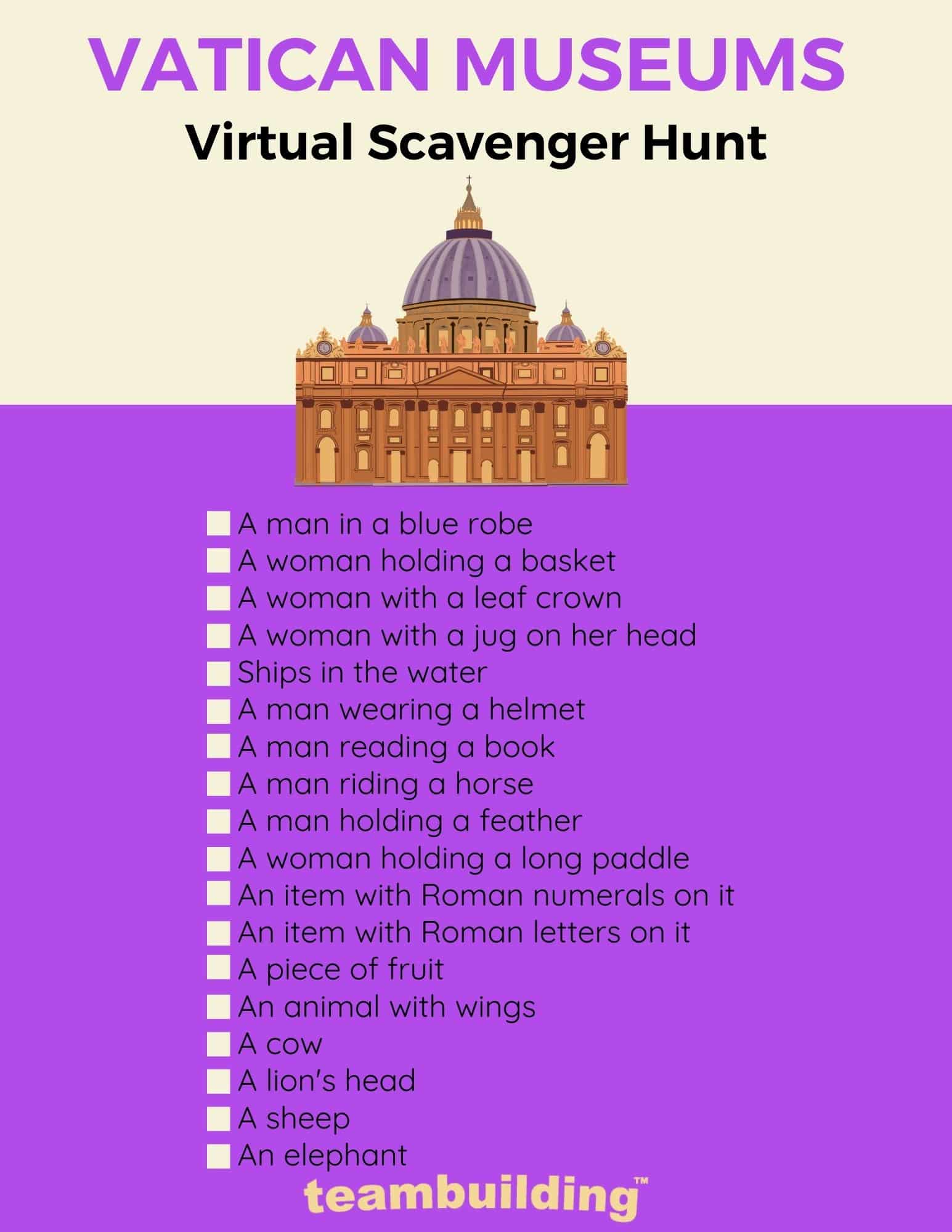 Virtual museum scavenger hunts are opportunities to bring a team or group of students together for a fun team building activity. This activity is especially helpful for virtual teams who do not gather often. These hunts are also opportunities to explore museums and places that your scavenger hunters may not have explored otherwise.