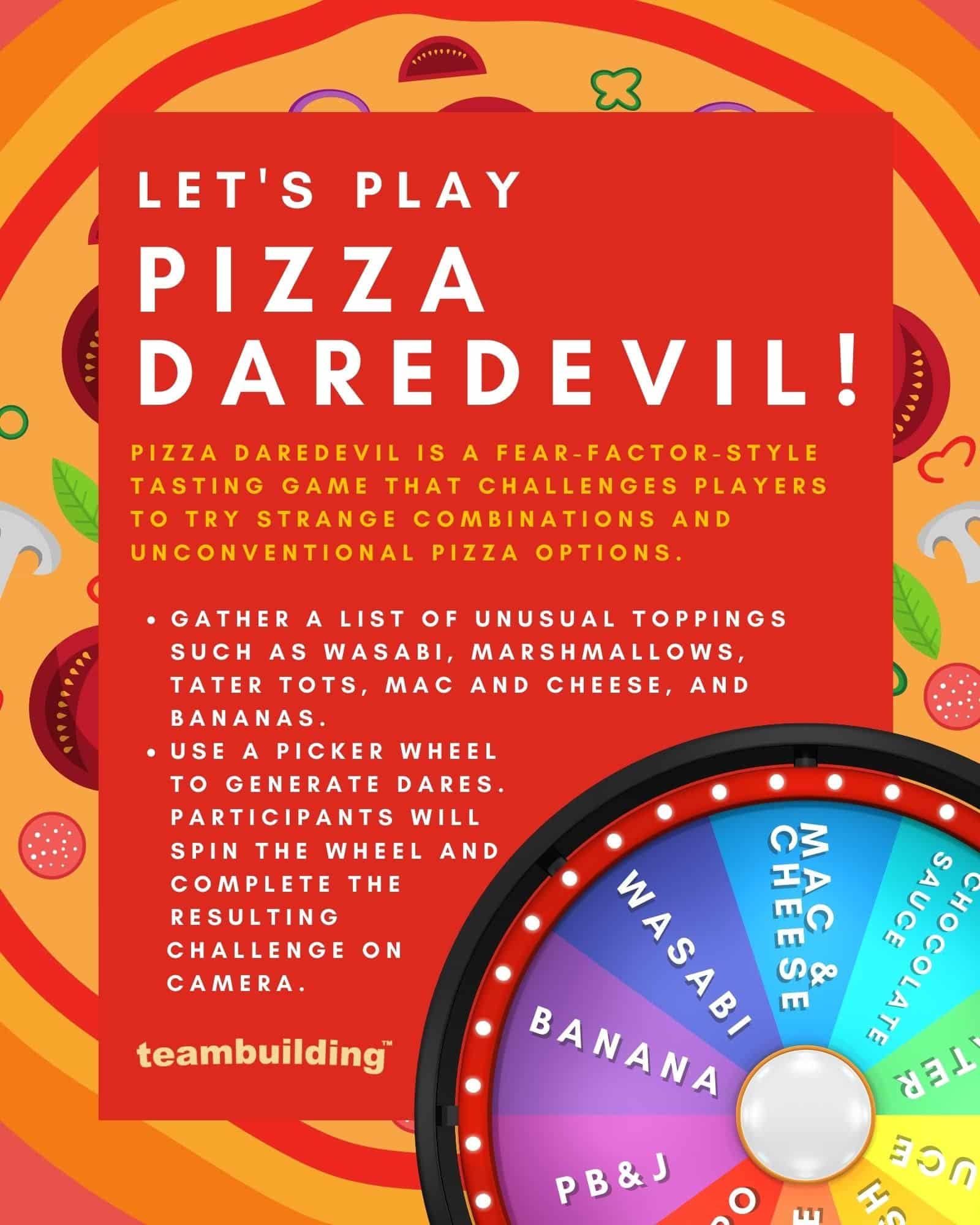 Pizza daredevil is a Fear-Factor-style tasting game that challenges players to try strange combinations and unconventional pizza options. To prepare the activity, gather a list of unusual toppings such as wasabi, marshmallows, tater tots, mac and cheese, and bananas. Be sure to give guests a heads up to have these ingredients on hand. Next, you can use a picker wheel to generate dares. Participants will spin the wheel and complete the resulting challenge on camera.