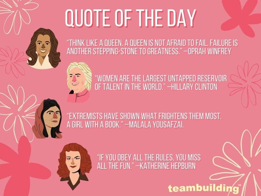 There is no shortage of wise words from women. To motivate your team during Women’s History Month, introduce a quote of the day series to share sayings from famous females. For each working day of the month, select an inspiring saying by a notable woman. The speakers could be current celebrities, authors, industry leaders, historical figures, or a combination of these groups. You can use these quotes during meetings and morning huddles, in the signature line or a special section of internal emails, on a community bulletin board, social media, or post in Slack. Feel free to crowdsource quotes from employees as well.